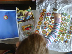 2 packs of crayons, and tons and tons of stickers! Emma is in the photo pointing to her favorite ones.